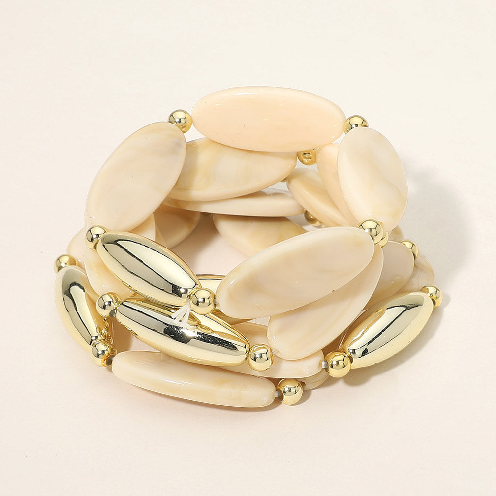 Stretch bracelet stack featuring smooth marquise-shaped beads accented with polished spacer details for a refined layered look. Lightweight and flexible for comfortable wear. Ideal for everyday styling, boutique displays, and effortless stackable trends.