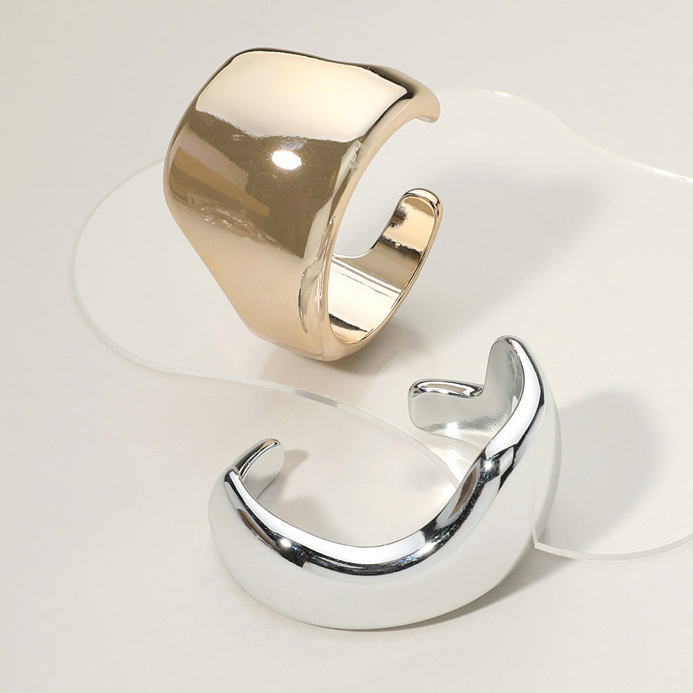 Slip on this eye-catching abstract metal wide cuff bracelet and let your wrist do the talking. Choose between lustrous gold or sleek silver to match your mood and style. The bold, artistic design features sweeping curves and geometric shapes that shimmer with every gesture, making it the perfect conversation starter. Whether you're dressing up for a night out or adding pizzazz to your everyday look, this statement piece brings personality and polish to your jewelry collection. Stack it, wear it solo, or mix and match—the possibilities are endless with this modern masterpiece on your arm.