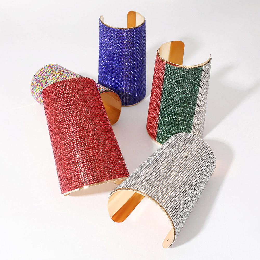 Get ready to dazzle with this show-stopping arm cuff bracelet that's bursting with personality. Featuring bold color blocks completely covered in sparkling rhinestones, in red, silver, multicolor, rainbow, gold, pink, and leopard print. This is your go-to piece for adding instant glam and fun to any look. Whether you're going for bold and bright or mixing patterns like a pro, this cuff bracelet delivers the bling and attitude your wrist has been craving.